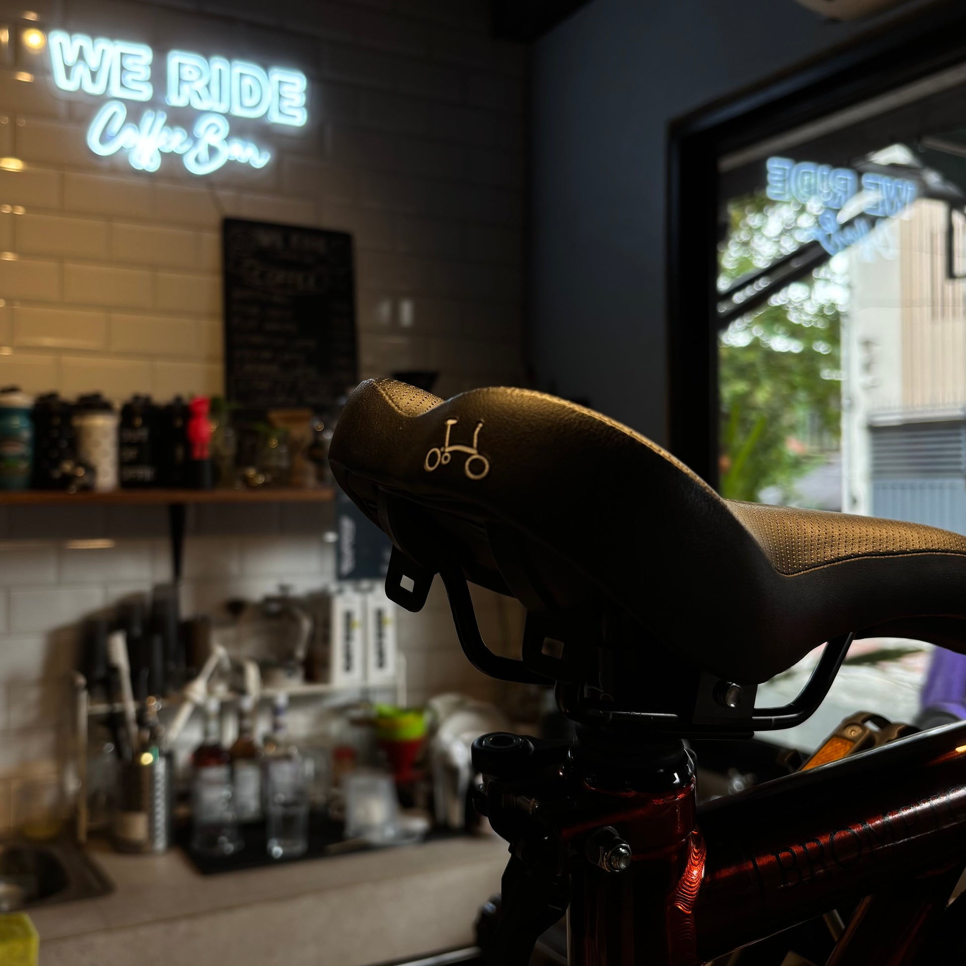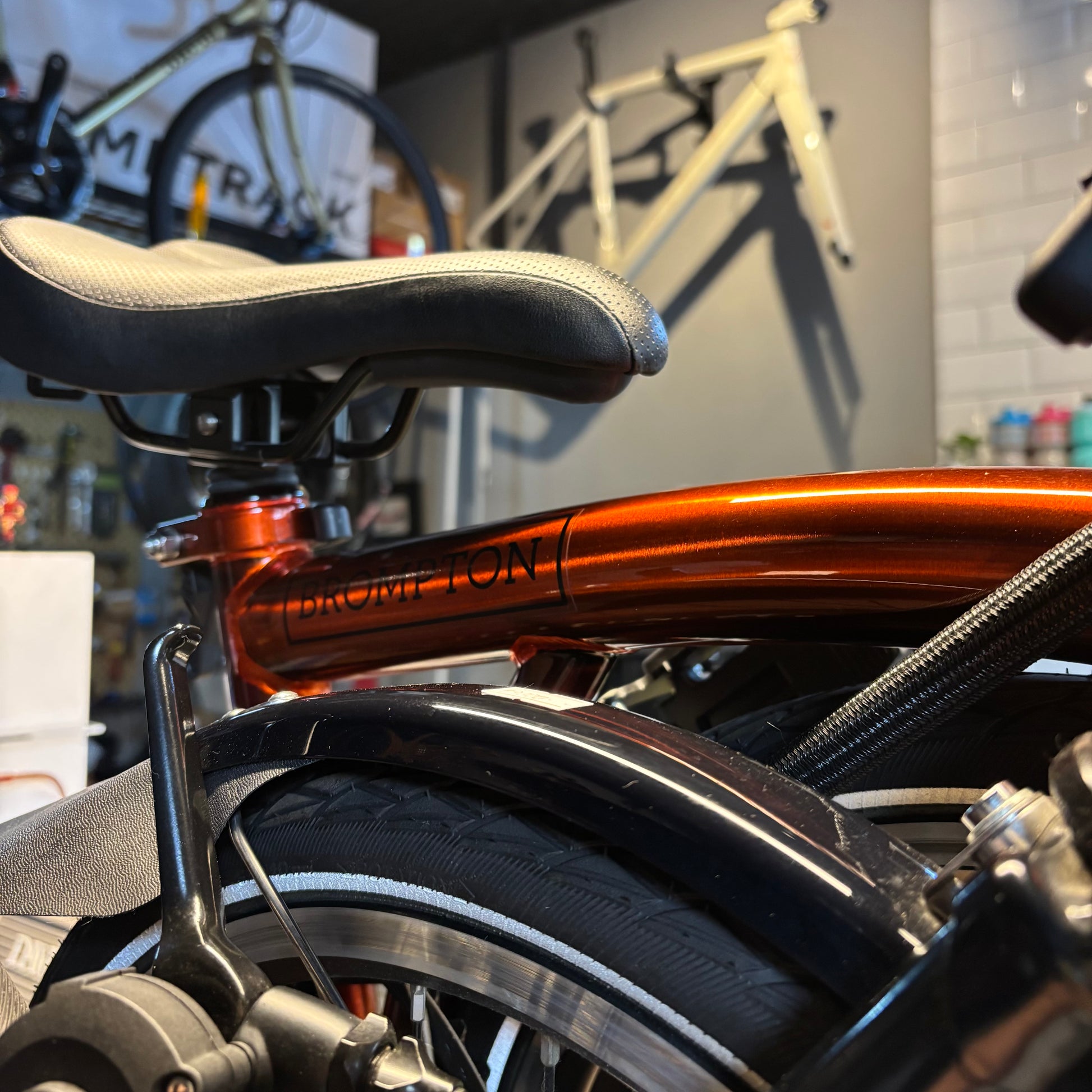 - Saddle: Brompton saddle, integrated carry handle, mounts for Brompton rear light and saddle bag
