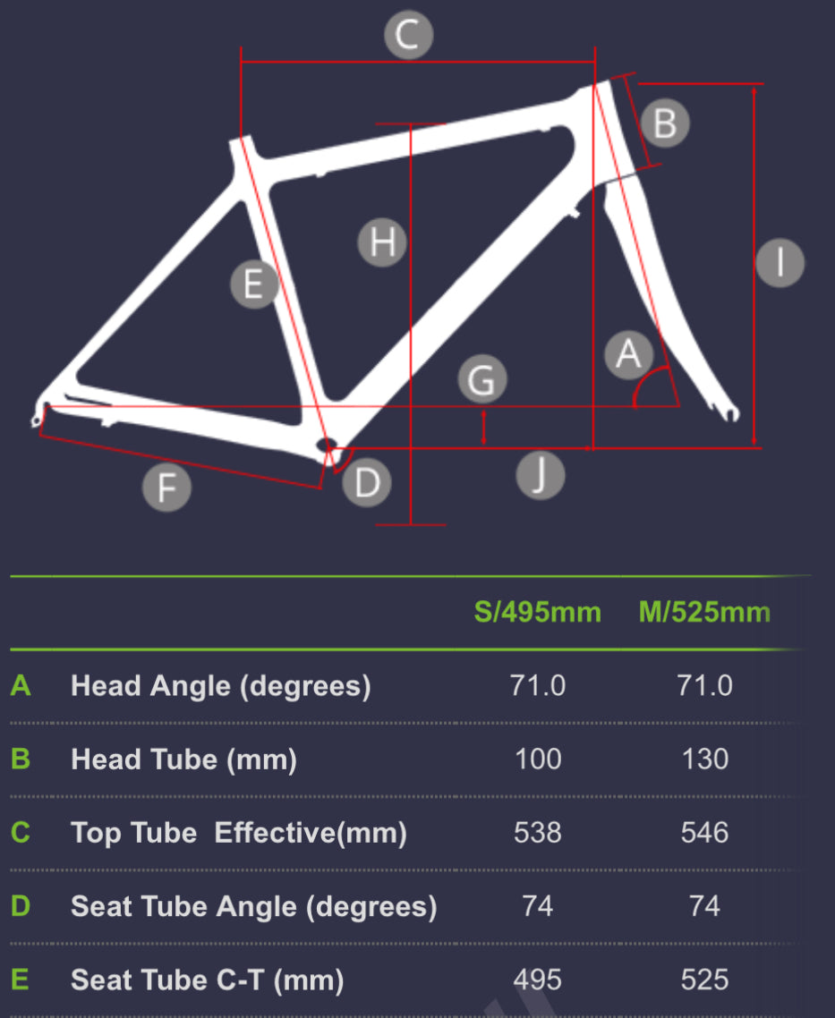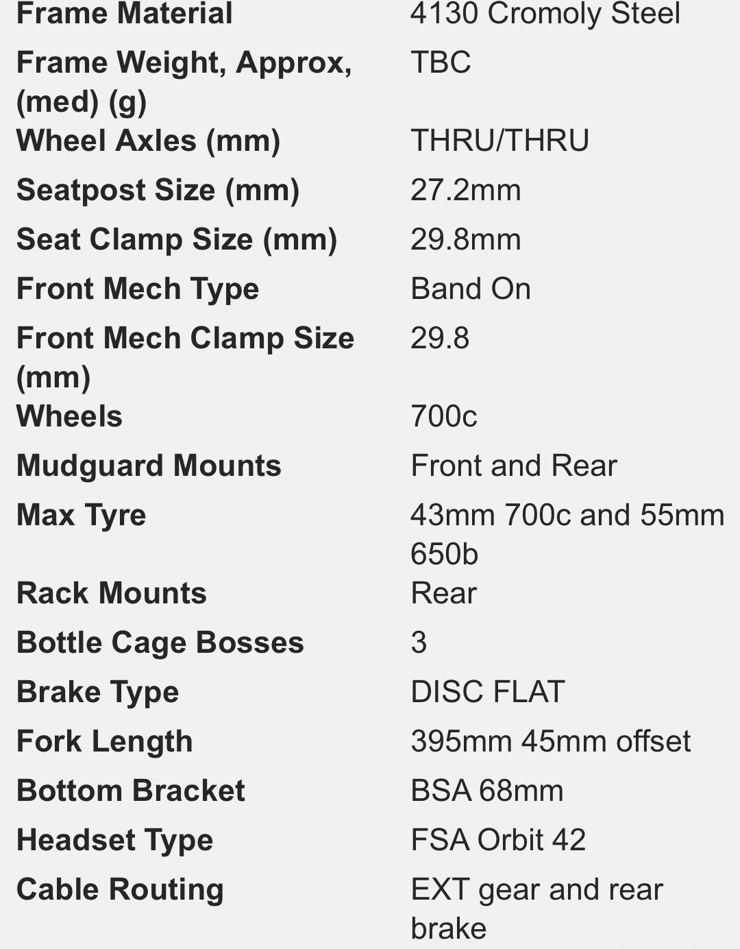 The core geometry of a fast and agile gravel fun machine. 71 degree head angle offers a trail figure that tackles singletrack with ease, yet sprints and climbs as capably as a racer. Road inspired reach figure keeps things fast, whilst the large front triangle adds frame bag capability and timeless looks. The 70mm BB drop keeps the rider planted like a road bike. Steeper seat tube creates efficient seated climbing position. Shortened 425mm chainstays keeps the back end agile. 700c x 43mm / 650B x 2.1-inch tyre clearance gives limitless exploration capabilities.