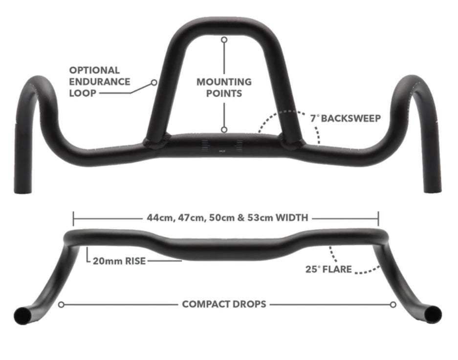 • 25° degrees of FLARE and a Compact Drop means a stable, aerodynamic drop position that is actually comfortable enough to use on your longest gravel ride or your next bikepacking trip.